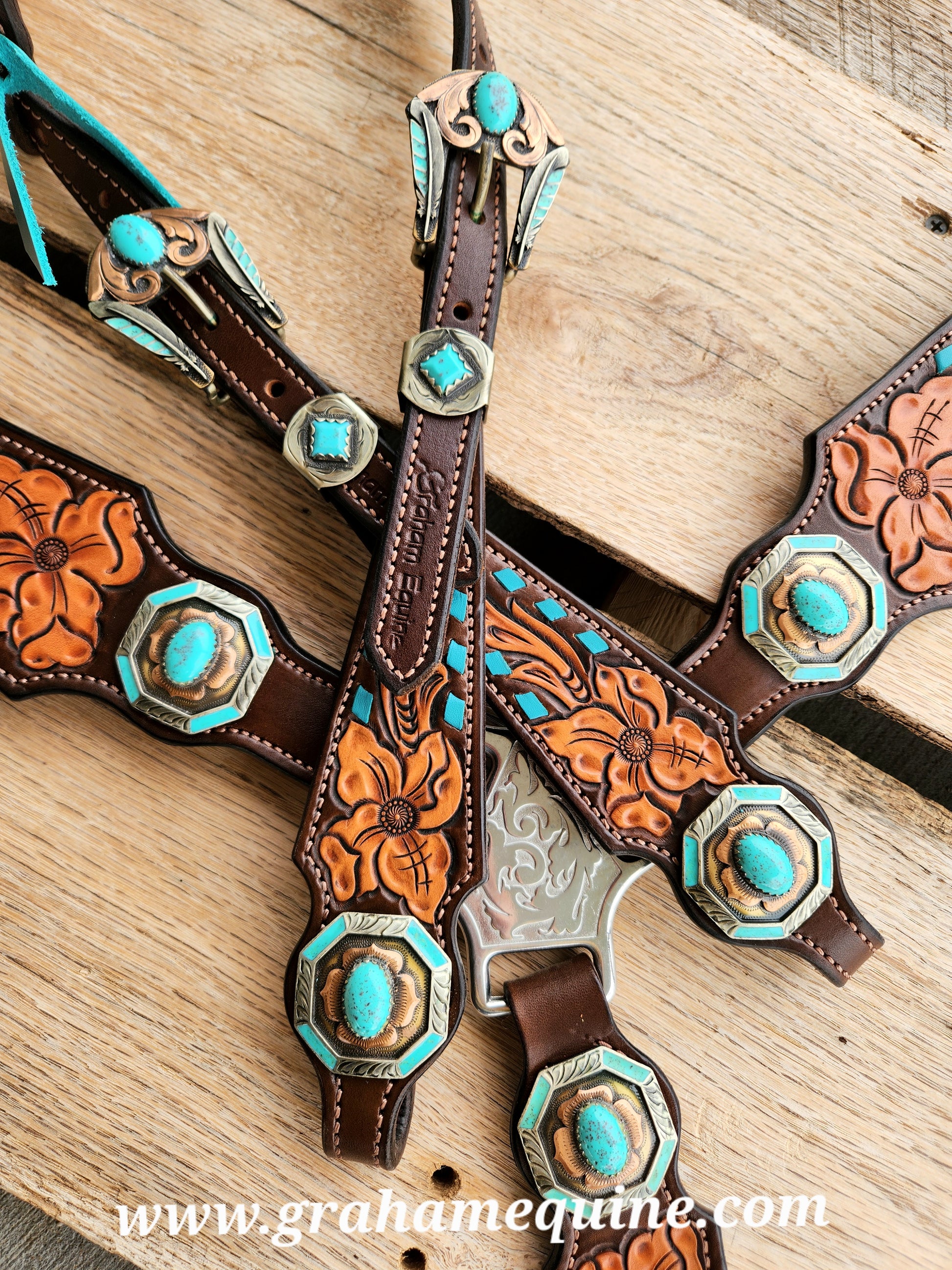 Gorgeous floral tooled tack set, has turquoise buckstitch and custom turquoise hardware. Fits a standard size horse.