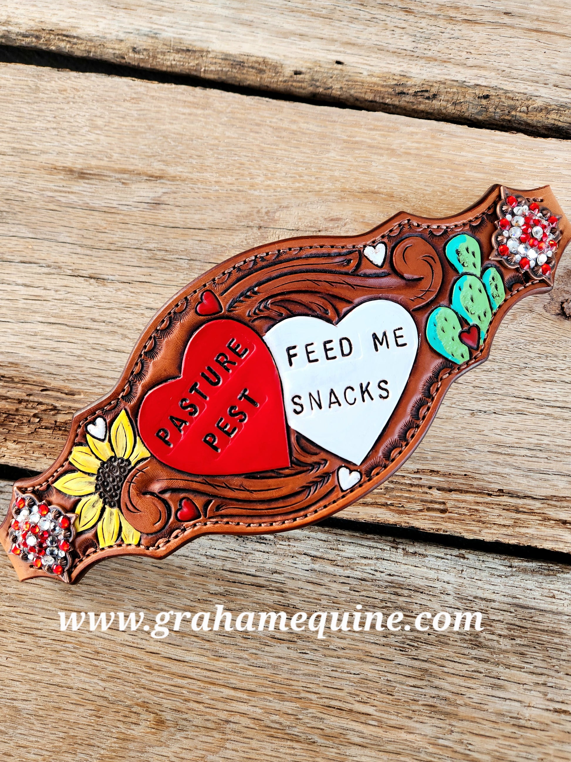 Valentine's Halters. Pasture Pest / Feed Me Snacks. On a red size avg Halter, bling conchos.