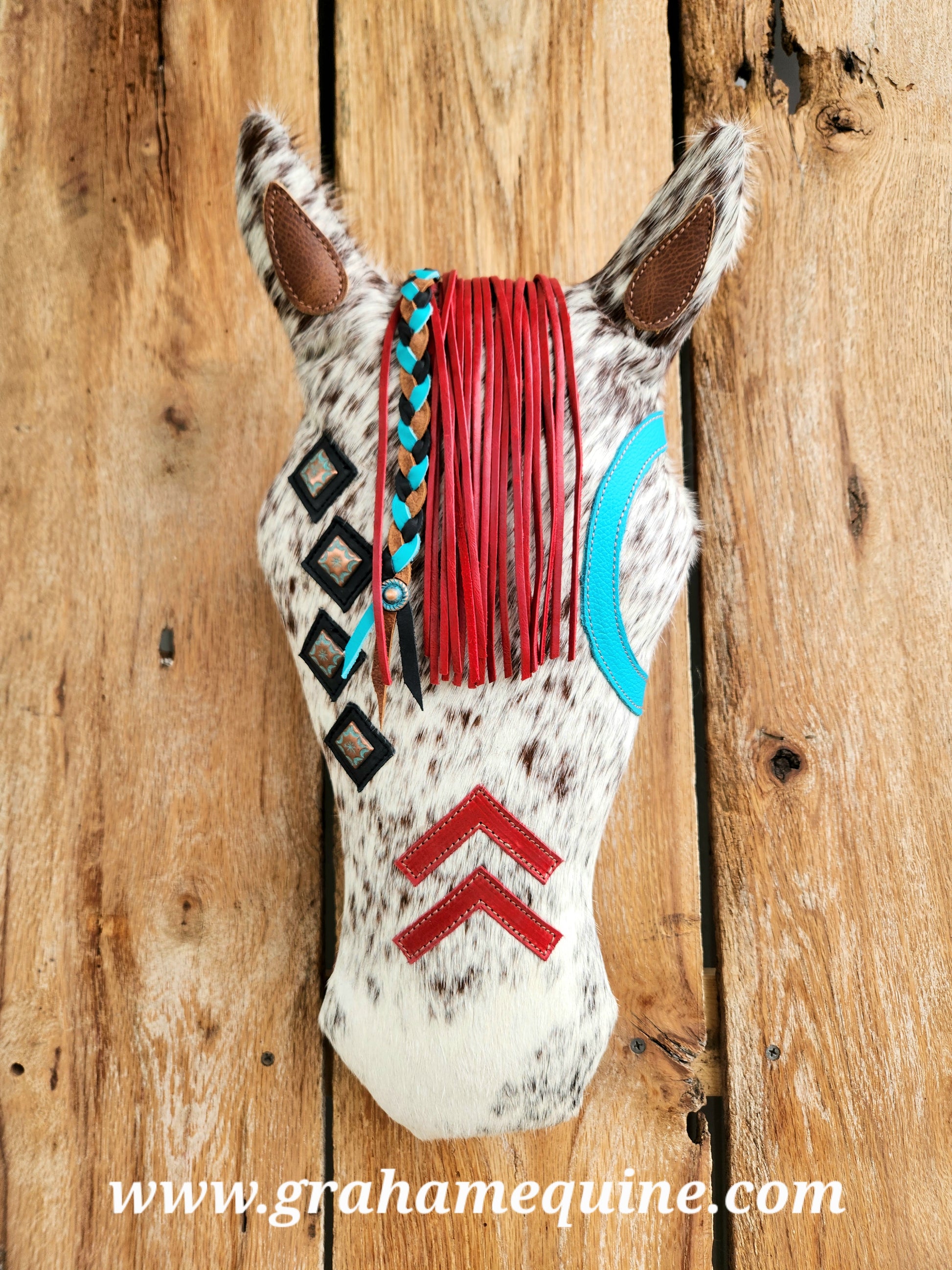 Our same great horse pillows, with a twist! Each one decorated like an Indian War Pony. No two the same, cowhide on the front, and smooth leather back. 18" x 8" Size.