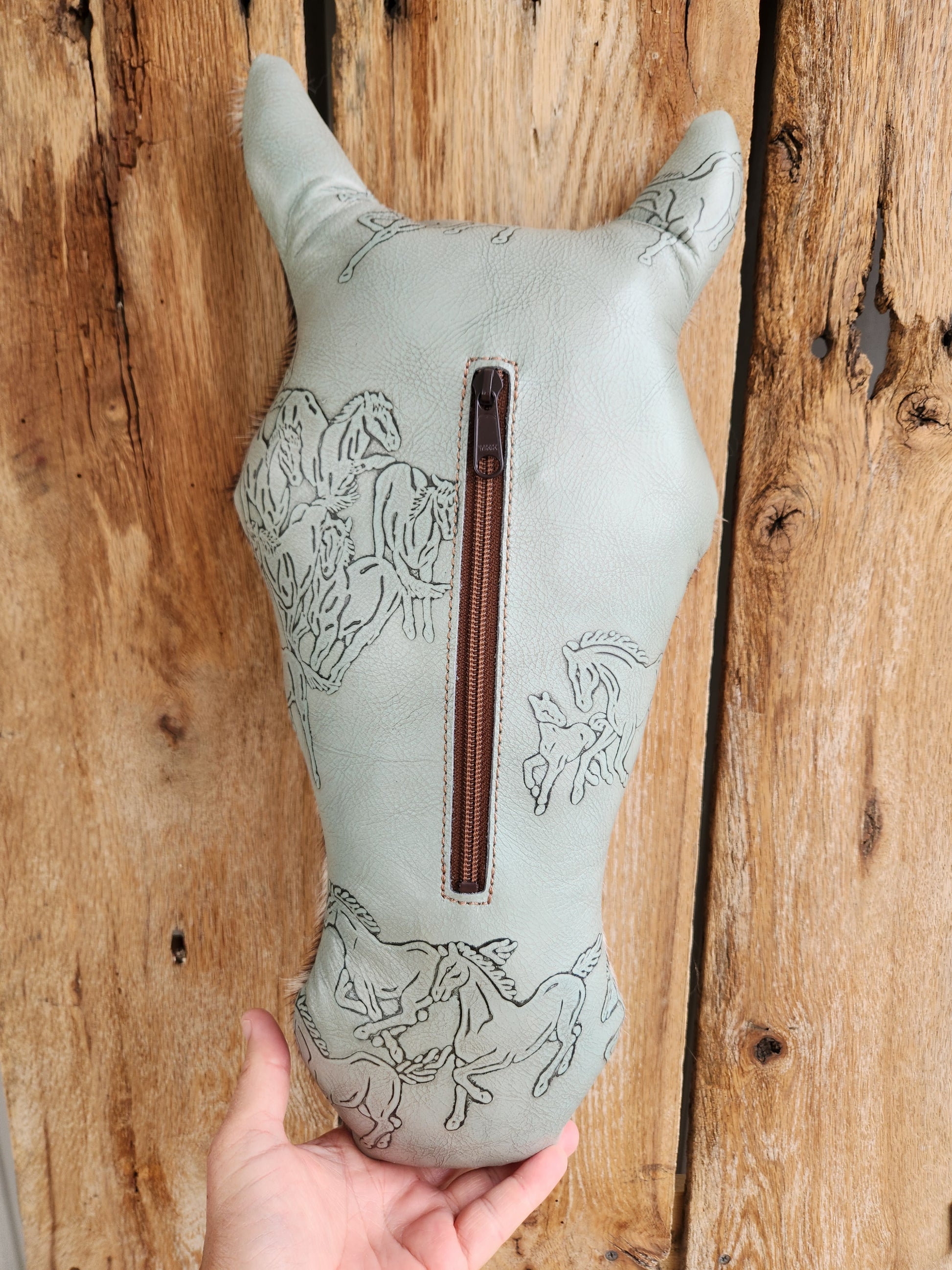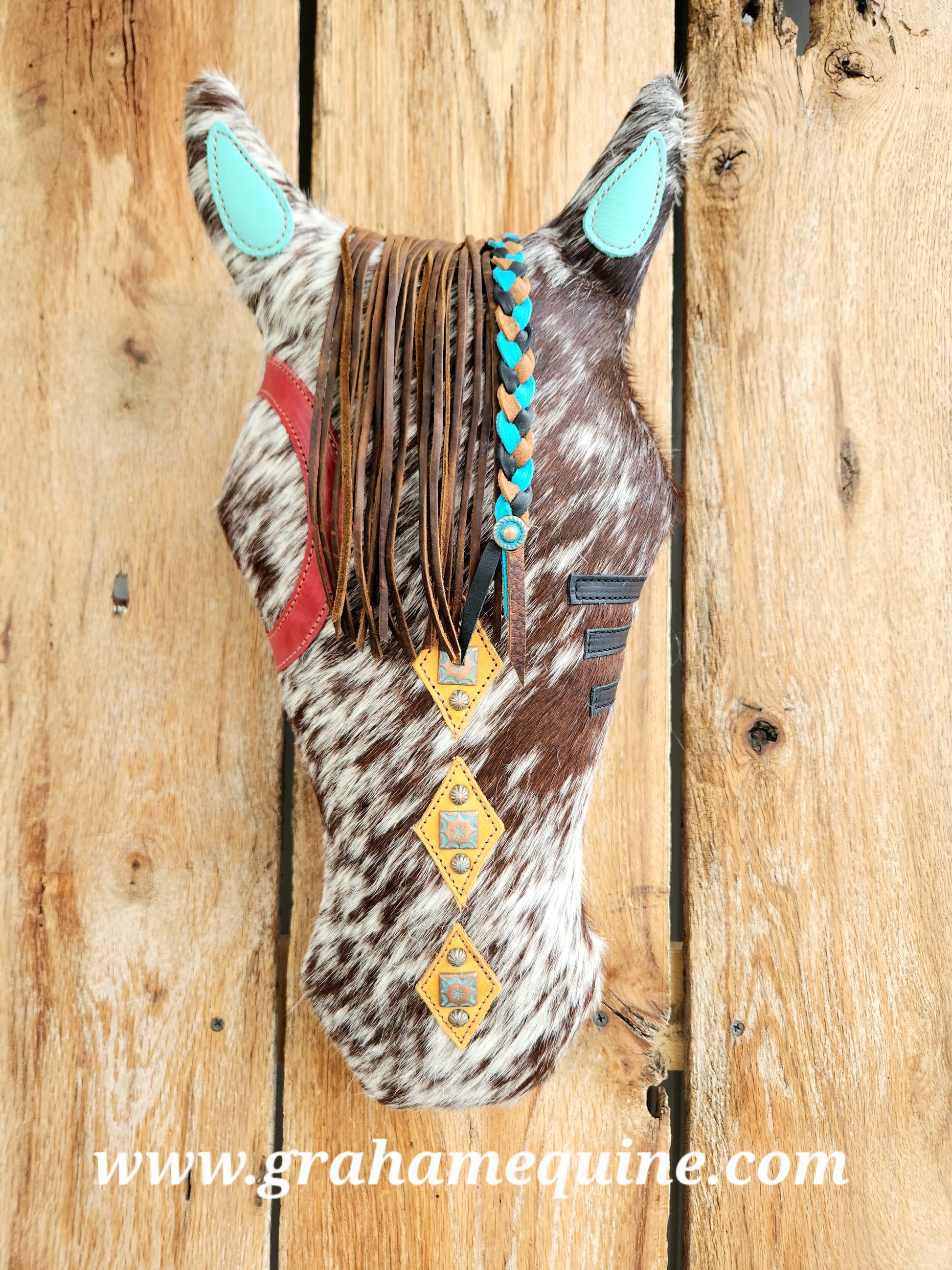 Our same great horse pillows, with a twist! Each one decorated like an Indian War Pony. No two the same, cowhide on the front, and smooth leather back. 18" x 8" Size.